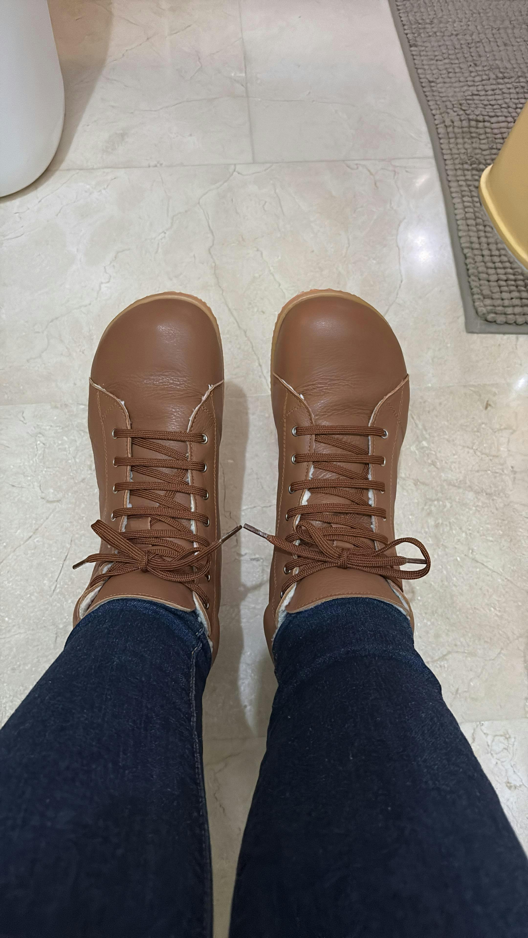 The barefoot boot you need this winter, crafted from premium leather in a tan color. Lined with organic cotton shearling to keep your feet warm and comfortable while you walk freely.