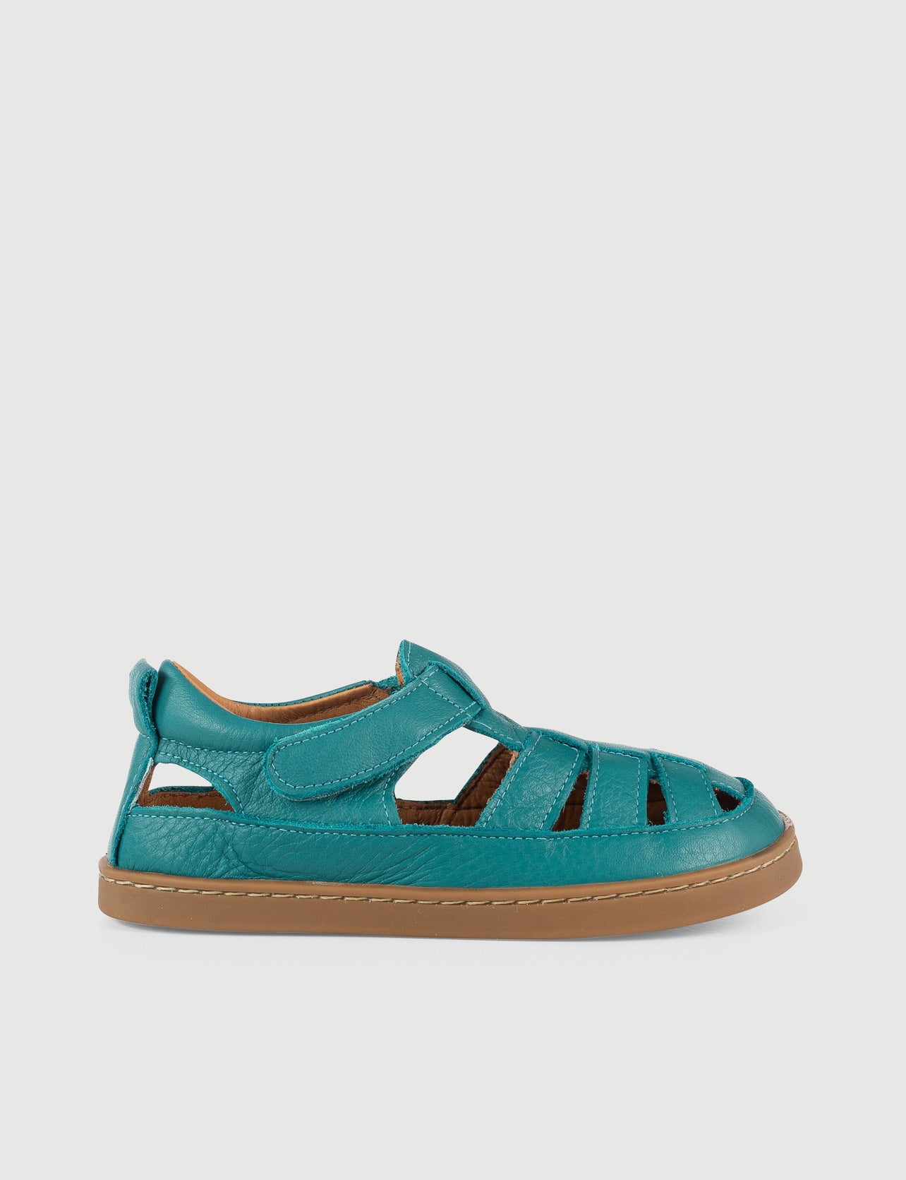 Sandalia respetuosa hecha en piel de primera calidad color turquesa. Su diseño ajusta perfectamente a pies medios y delgados, empeine medio y bajo. Tienen doble correa de velcro para ajustar a los tobillos más delgados.